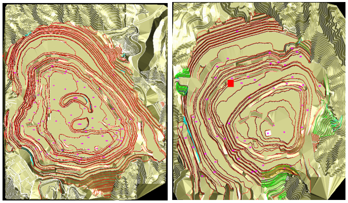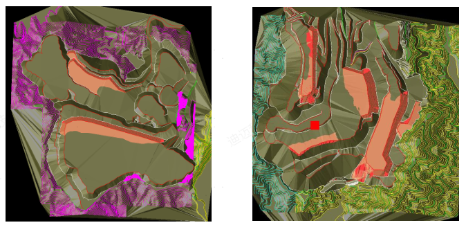 圖1-利用DIMINE構(gòu)建包含地形、礦體、邊坡等要素的三維實(shí)體模型